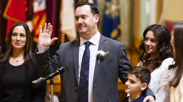 Jarrod Hochman is sworn into City Council for his first term during the City of Peabody Municipal Government Inauguration at Peabody City Hall on Monday.