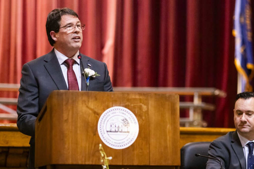 Mayor Ted Bettencourt addresses guests during the City of Peabody Municipal Government Inauguration at Peabody City Hall on Monday.