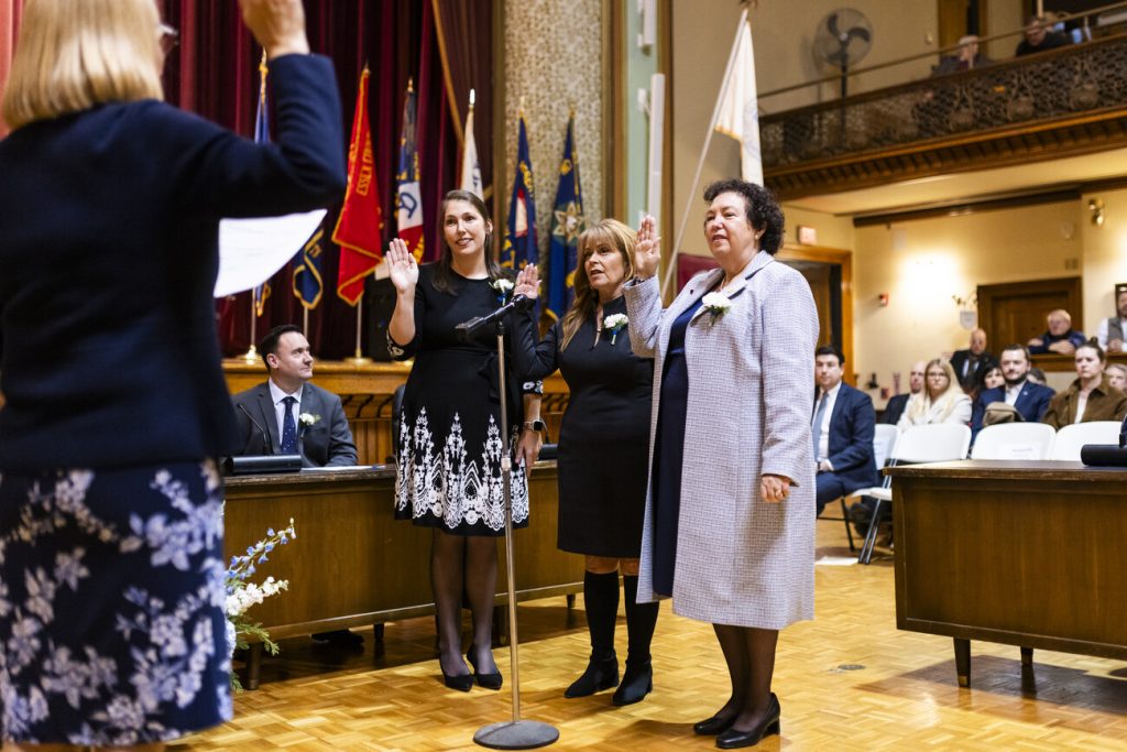 From left, Suzanne Cox, Pamela Susan Milman, and Beverley Ann Griffin Dunne are sworn into School Committee during the City of Peabody Municipal Government Inauguration at Peabody City Hall on Monday.