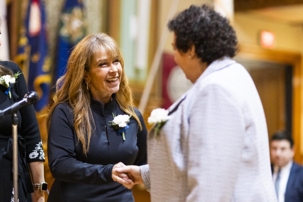 Pamela Susan Milman, left, and Beverley Ann Griffin Dunne shake hands after being sworn into School Committee during the City of Peabody Municipal Government Inauguration at Peabody City Hall on Monday.