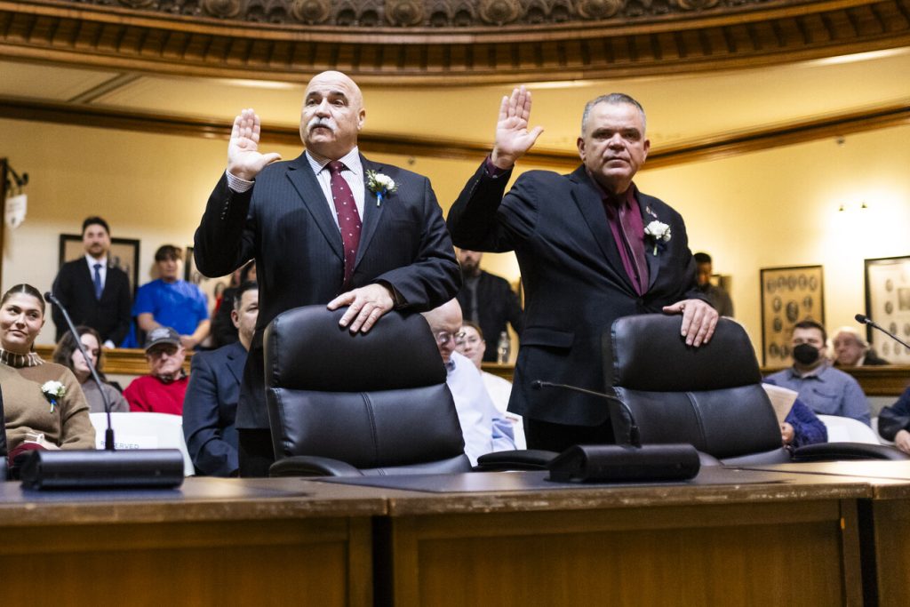 Dave Gamache, left, and Jon Turco are sworn into City Council during the City of Peabody Municipal Government Inauguration at Peabody City Hall on Monday.