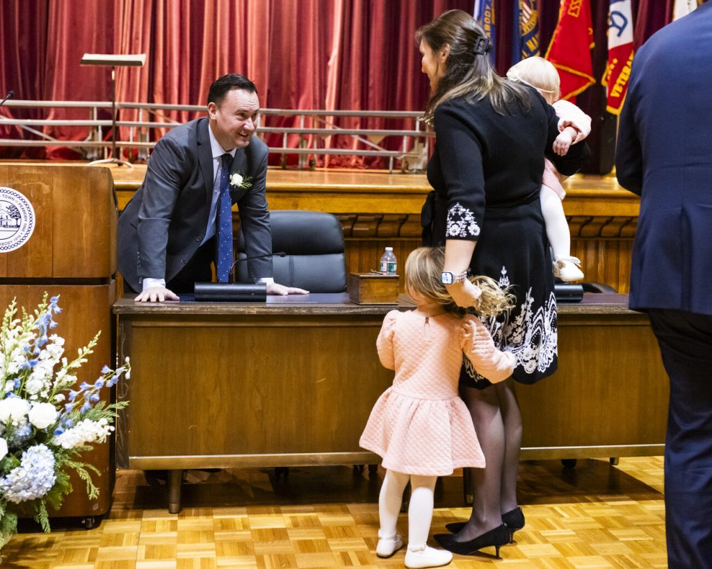 Mayor Ted Bettencourt shares a moment with School Committee member Suzanne Cox and her children after the City of Peabody Municipal Government Inauguration at Peabody City Hall on Monday.