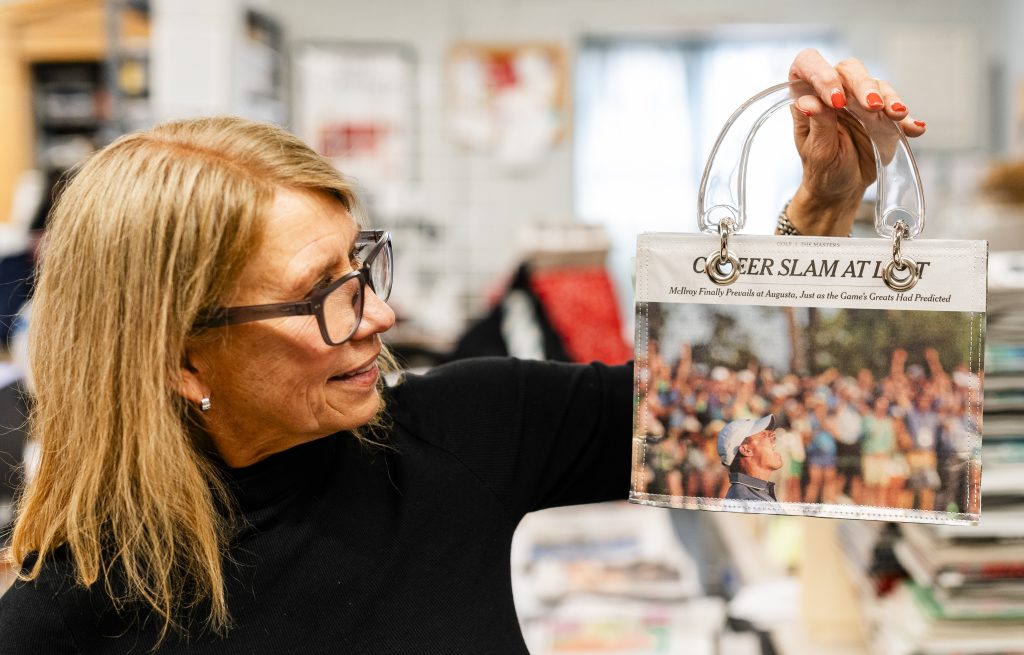 During the Masters, viewers might’ve noticed a unique handbag carried around by Rory McIlroy’s mom, Rosie, which featured a newspaper design depicting her son’s Masters win in 2025. This bag circulated online and turned out to be Couture Planet’s “Rory Career Slam Bag.”