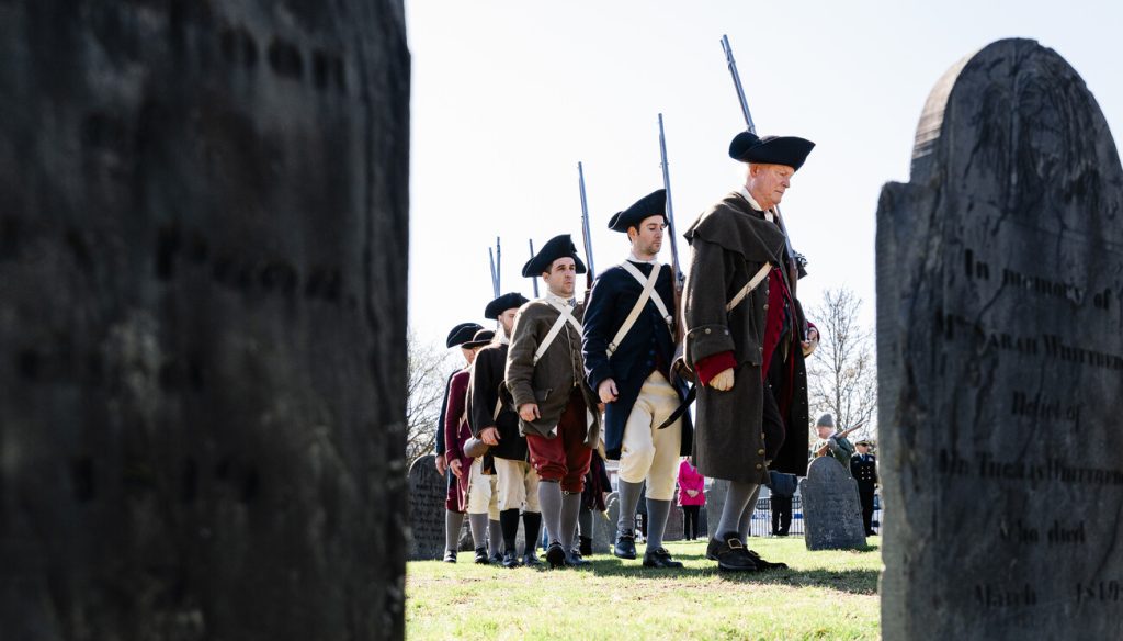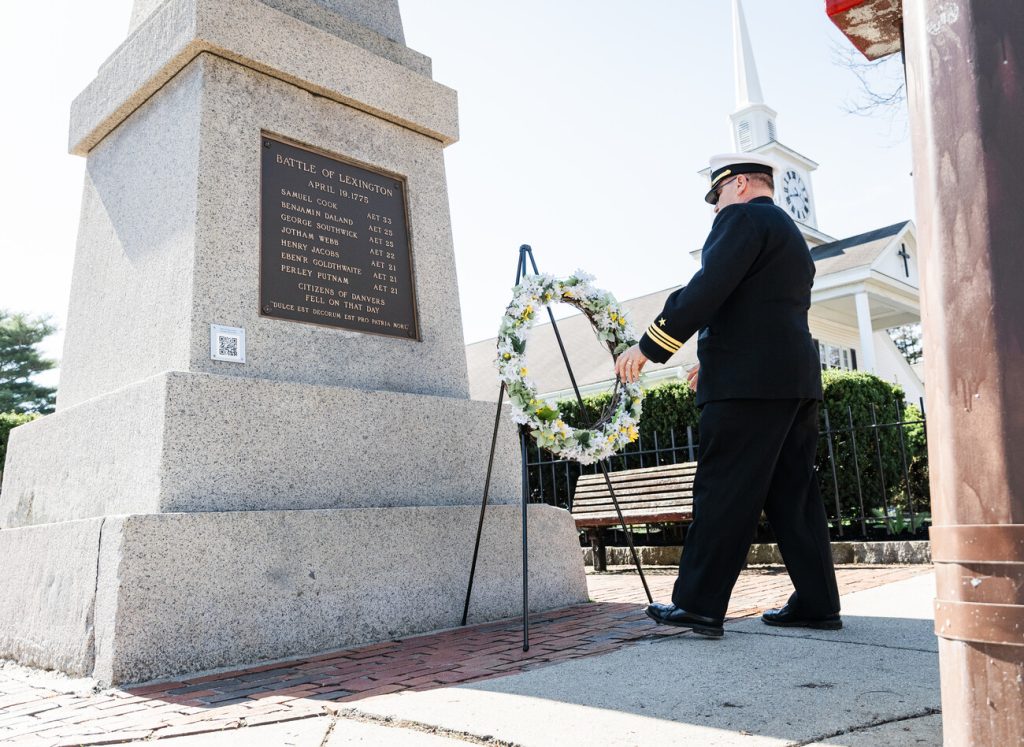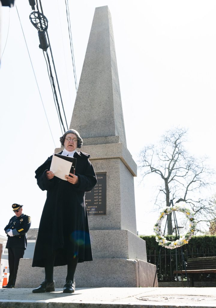 Peabody honors those fallen soldiers each year, with this year’s program beginning at the Jacobs Family Cemetery, continuing to the Old South Burial Ground, and ending at the Lexington Monument. Members of the Danvers Alarm List Company led the way in period clothing, firing ceremonial rounds at each stop.