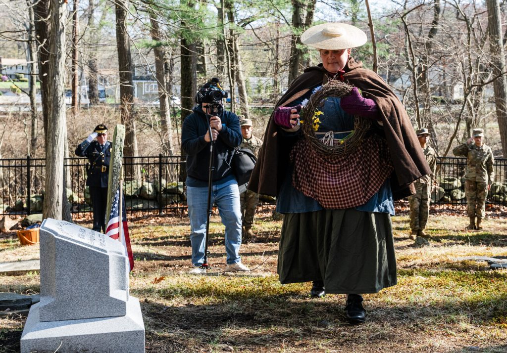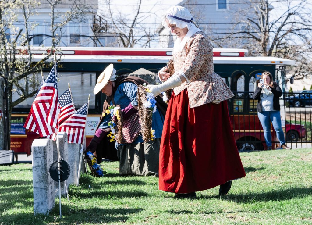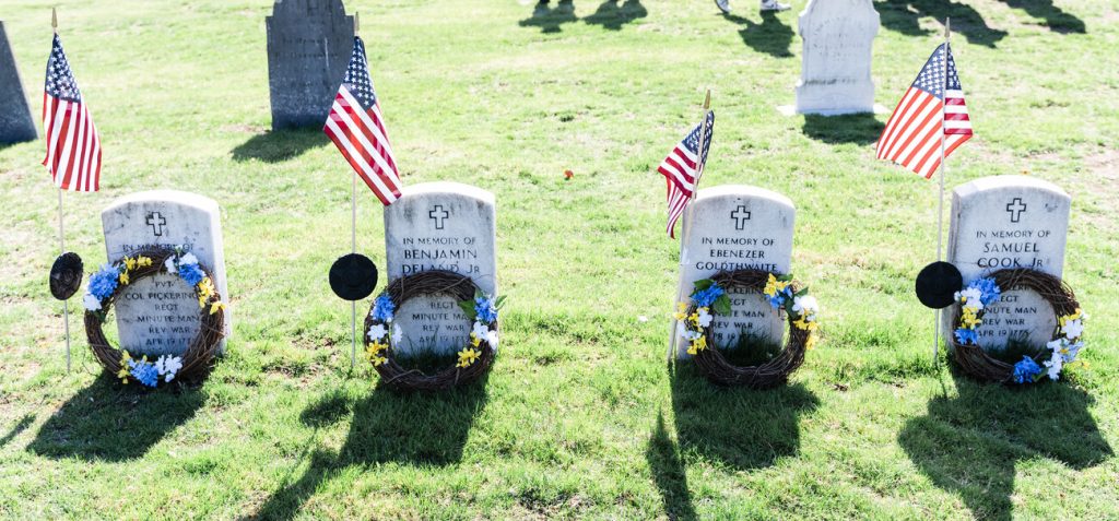 Participants then moved to the Old South Burial Ground, where wreaths were placed at the gravestones of four soldiers from the area who were killed during that early Revolutionary battle: Ebenezer Goldwaite, George Southwick, Samuel Cook, and Benjamin Daland.