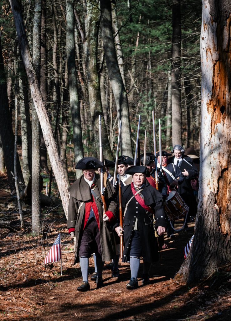 Members of the Peabody Veterans Memorial High School JROTC served as a color guard, while reenactors marched down the wooded path to the beat of a drum before raising their muskets in a coordinated volley.