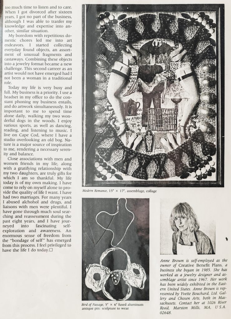 Throughout the 1970s, Brown became increasingly embedded in a growing creative community. She co-founded the collective “Seven at Large,” a group of female artists which also included photographer Olivia Parker. Together, they created the seminal show “Organic Visions, Seven at Large,” a groundbreaking installation at the Boston Museum of Science. Brown would continue to gain more recognition and be featured in exhibitions such as “American Images I & II” at the Goethe Institute between 1974-76 in Boston, and in 1981, her work was chosen as one of ten contemporary jewelry artists presented at the “International Collectors Seminar” at the Cooper Hewitt Museum of Design in New York City. Each opportunity affirmed what Brown already knew: her work didn’t need to fit within traditional boundaries to matter.