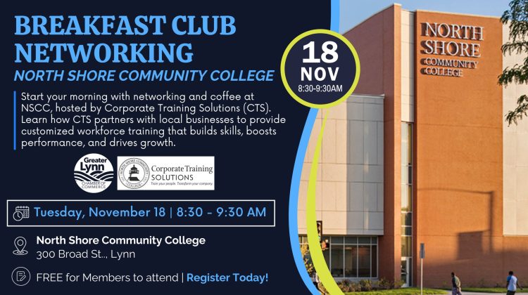 Start your morning with networking and coffee at North Shore Community College, hosted by Corporate Training Solutions (CTS). Learn how CTS partners with local businesses to provide customized workforce training that builds skills, boosts performance, and drives growth.